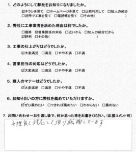 お客様の声 今回は、トイレ工事(1F/2F)を行いました。「職人さんの工事とクロス屋さんの連携がスムーズで 作業が効率的でした。 何かあれば、又、お願いしたいです。」 アンケートをお寄せいただきまして、ありがとうございま […]
