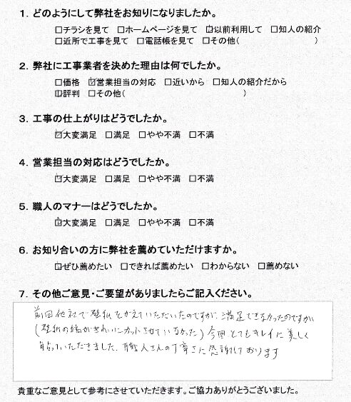 「前回他社で壁紙をかえていただいたのですが、満足できなかったのですが(壁紙の端がきれいにカットされていなかった)今回とてもキレイに美しく貼っていただきました。職人さんの丁寧さに感謝しております」