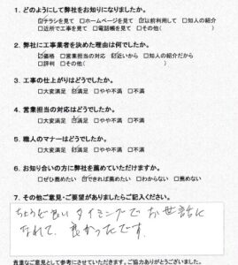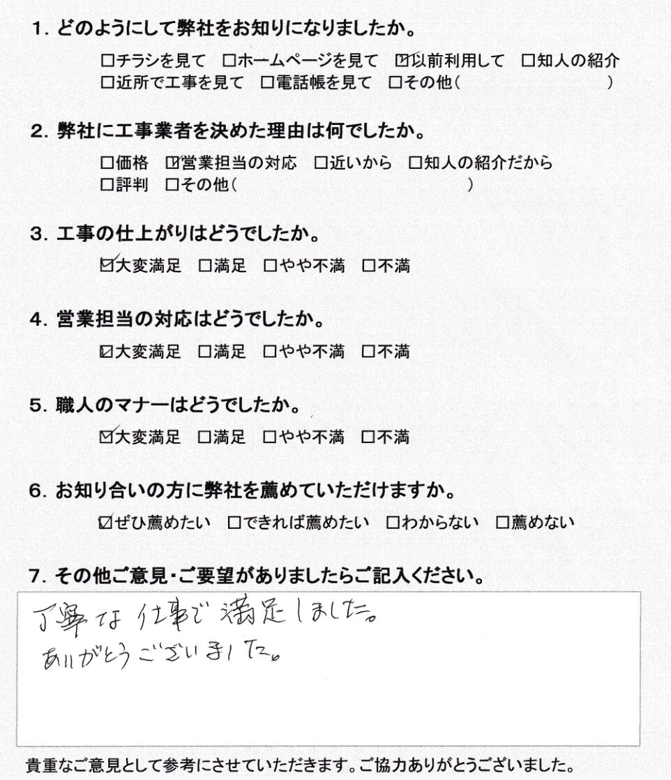 綾瀬市綾西 O様 2024/12/04 最終更新日時 : 2025/03/05 iine_service Screenshot お客様の声 「丁寧な仕事で満足しました。 ありがとうございました。」 アンケートをお寄せいただきまして、ありがとうございました! 施工内容を見る