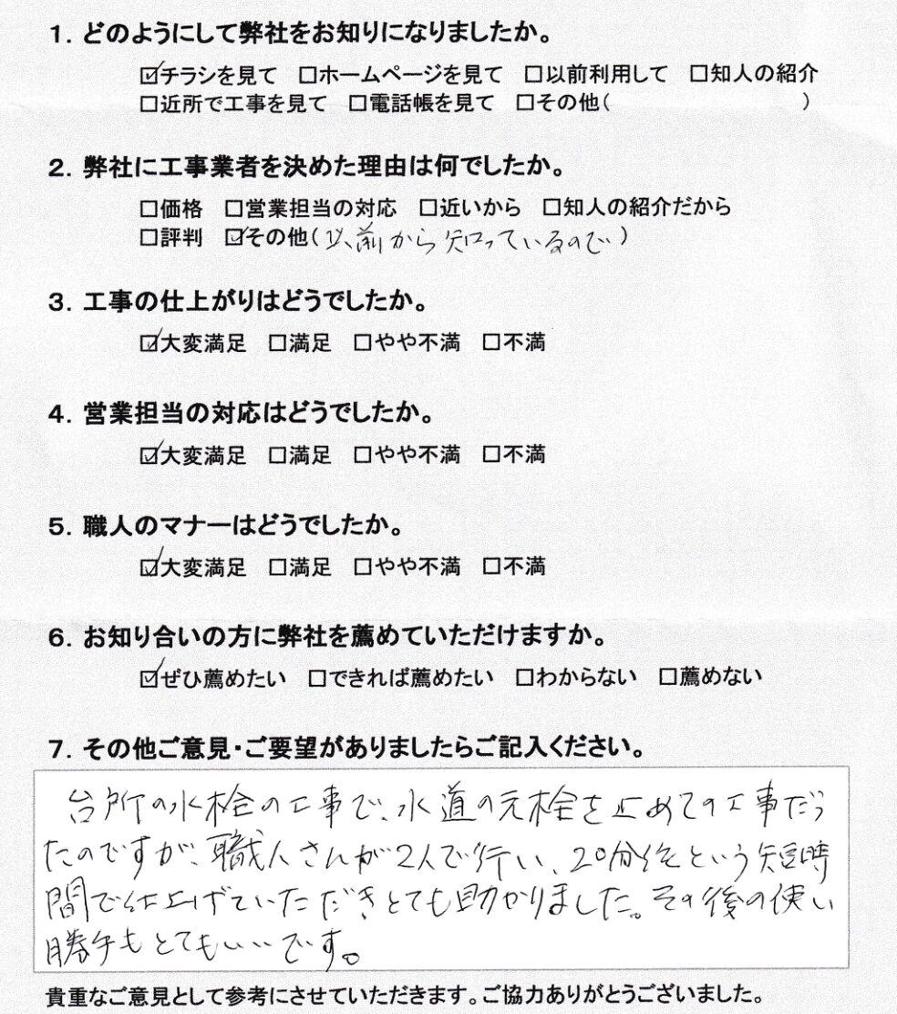 「台所の水栓の工事で、水道の元栓を止めての工事だったのですが、職人さんが2人で行い、20分位という短時間で仕上げていただきとても助かりました。その後の使い勝手もとてもいいです。」