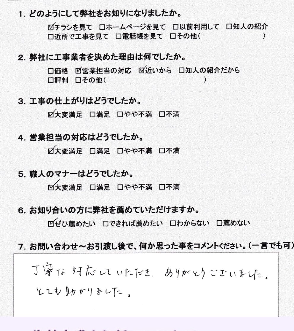 海老名市国分南W様 2025/05/03 最終更新日時 : 2025/05/03 iine_service お客様の声 今回、家電搬入の為、室内ドアの脱着を行いました。 「丁寧な対応していただき、ありがとうございました。とても助かりました。」 アンケートをお寄せいただきまして、ありがとうございました!
