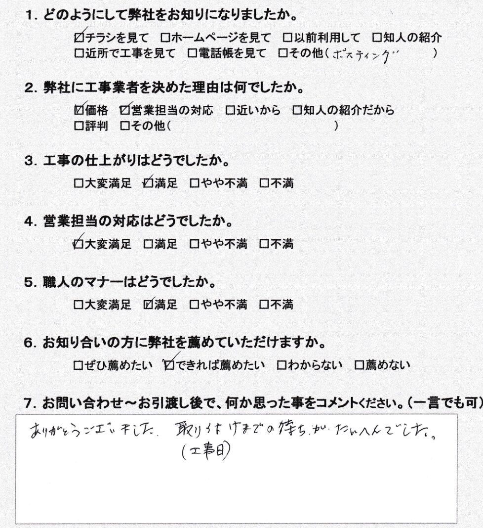 「ありがとうございました。取り付け(工事日)までの待ちがたいへんでした。」