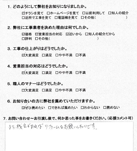 海老名市東柏ヶ谷T様 2025/10/05 最終更新日時 : 2025/10/05 iine_service お客様の声 今回は、マンションの浴室工事と洗面所工事を行いました。「また機会があればリフォームをお願いしたいです。」 アンケートをお寄せいただきまして、ありがとうございました! 施工内容を見る