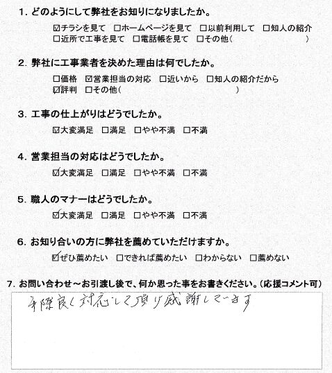 海老名市柏ヶ谷Y様 2025/11/03 最終更新日時 : 2025/11/03 iine_service お客様の声 今回は、トイレの交換工事を行いました。「手際良く対応して頂け感謝しています」 アンケートをお寄せいただきまして、ありがとうございました! 施工内容を見る