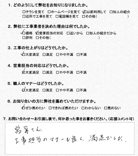 海老名市大谷北M様 2025/11/03 最終更新日時 : 2025/11/03 iine_service お客様の声 今回は、和室の畳をフローリングにして壁のクロスの貼り替えも行いました。「営業さん、工事担当のマナーも良く、満足でした。」 アンケートをお寄せいただきまして、ありがとうございました! 施工内容を見る