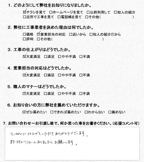 海老名市東柏ヶ谷O様 2025/11/09 最終更新日時 : 2025/11/09 iine_service お客様の声 今回は、トイレと浴室水栓の交換工事を行いました。「ていねいに仕上げて頂きありがとうございます。 また何かリフォームありましたらお願いします。」 アンケートをお寄せいただきまして、ありがとうございました! 施工内容を見る