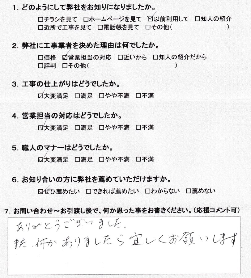 海老名市国分寺台M様 2025/11/22 最終更新日時 : 2025/11/30 iine_service お客様の声 今回は、階段に手摺りを取付ました。「ありがとうございました。 また、何かありましたら宜しくお願いします」 アンケートをお寄せいただきまして、ありがとうございました! 施工内容を見る