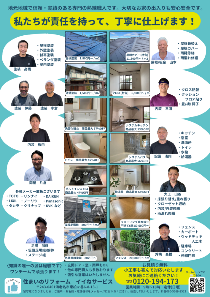 | 内装/外装修繕 | 雨漏れ修繕 |