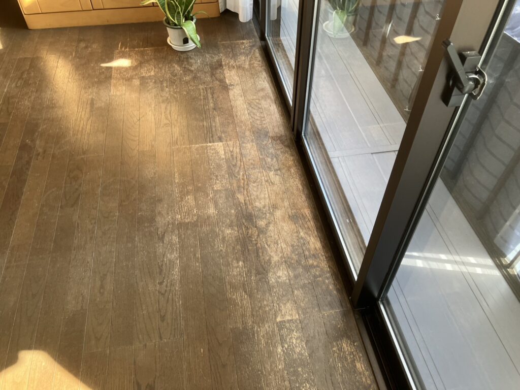 経年劣化と日光の影響で、床の色褪せや表面の剥がれなどの傷みがありました。
