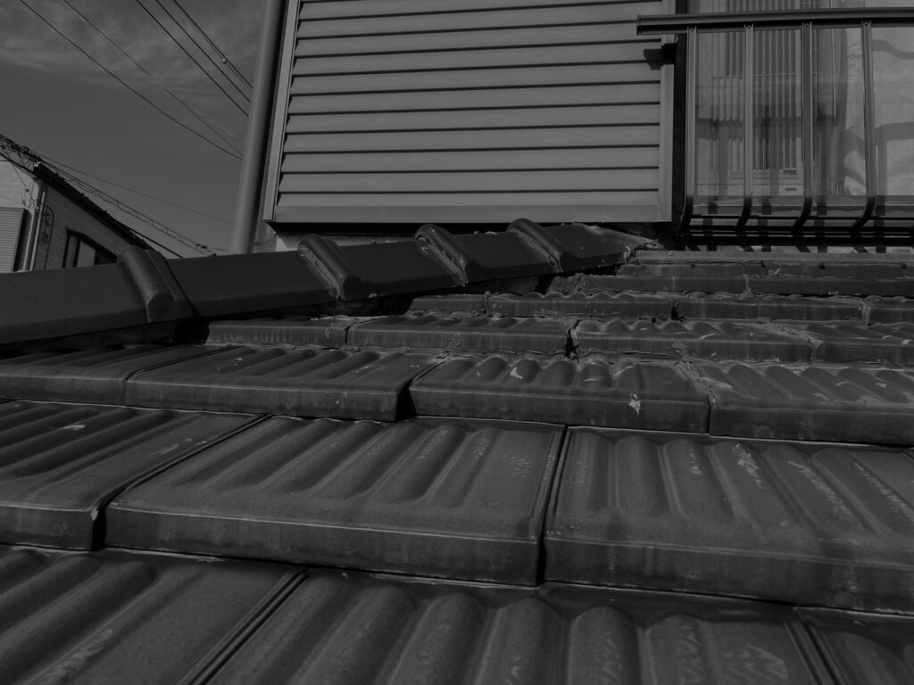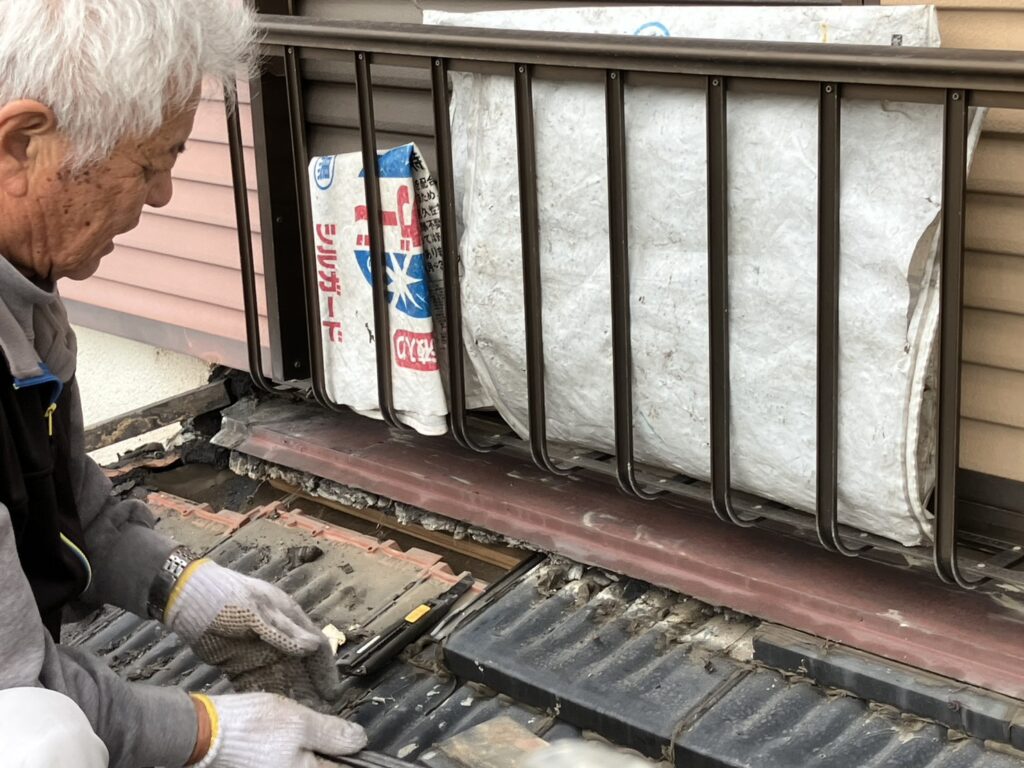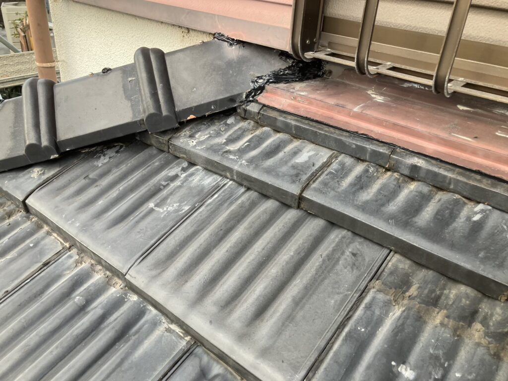室内に雨染みが確認でき、瓦屋根を確認したところ、壁の取り合いの板金処理や瓦のズレ(棟を含む)、防水シートも腐蝕していました。